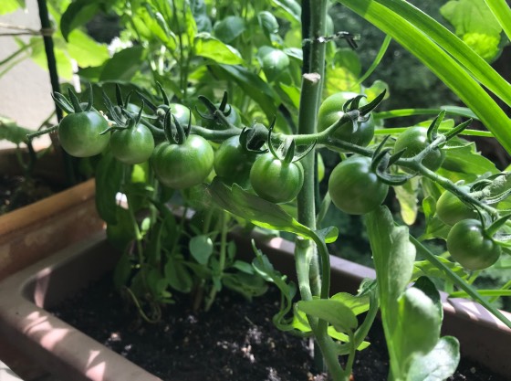トマトは実がついてきたので、大きくなるのを待つばかり。隣のバジルはちょっと大きくなりすぎかも。